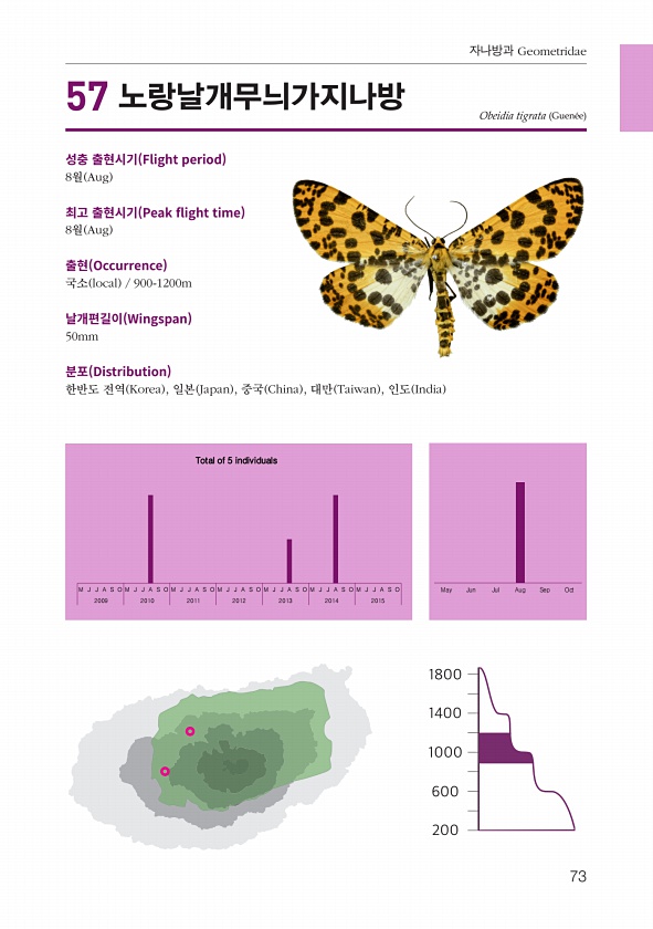 73 자나방과 Geometridae 성충 출현시기 Flight period 8월 Aug 최고 출현시기 Peak fight time 8월 Aug 출현 Occurrence 국소 local 900-1200m 날개편길이 Wingspan 50mm 분포 Distribution 한반도 전역 Korea , 일본 Japan , 중국 China , 대만 Taiwan , 인도 India 57 노랑날개무늬가지나방 Obeidia tigrata Guen?e M J J A S O M J J A S O M J J A S O M J J A S O M J J A S O M J J A S O M J J A S O May Jun Jul Aug Sep Oct 2009 2010 2011 2012 2013 2014 2015 Total of 5ind...
