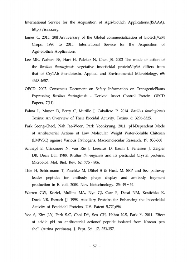 International Service for the Acquisition of Agri-biothch Applications. ISAAA , http//isaaa.org James C. 2015. 20thAnniversary of the Global commercialization of Biotech/GM Crops1996 to 2015. International Service for the Acquisition of Agri-biothch Applications. Lee MK, Waiters FS, Hart H, Palekar N, Chen JS. 2003 The mode of action of the Bacillus thuringiensis vegetative insecticidal proteinVip...