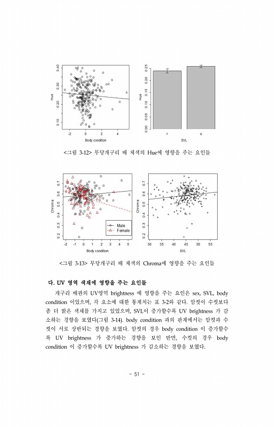 51 그림 3-12 무당개구리 배 체색의 Hue에 영향을 주는 요인들 그림 3-13 무당개구리 배 체색의 Chroma에 영향을 주는 요인들 다. UV 영역 색채에 영향을 주는 요인들 개구리 배판의 UV영역 brightness 에 영향을 주는 요인은 sex, SVL, body condition 이었으며, 각 요소에 대한 통계치는 표 3-2와 같다. 암컷이 수컷보다 좀 더 밝은 색채를 가지고 있었으며, SVL이 증가할수록 UV brightness 가 감 소하는 경향을 보였다 그림 3-14 body condition 과의 관계에서는 암컷과 수 컷이 서로 상반되는 경향을 보였다. 암컷의 경우 body condition 이 증가할수 록 UV brightness 가 증가하는 경향을 보인 반면, 수컷의 경우 body c...