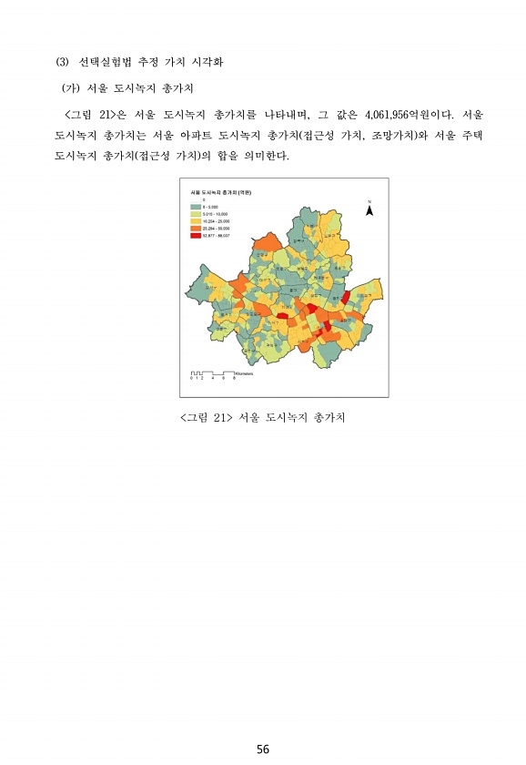 56 3 선택실험법 추정 가치 시각화 가 서울 도시녹지 총가치 그림 21 은 서울 도시녹지 총가치를 나타내며, 그 값은 4,061,956억원이다. 서울 도시녹지 총가치는 서울 아파트 도시녹지 총가치 접근성 가치, 조망가치 와 서울 주택 도시녹지 총가치 접근성 가치 의 합을 의미한다. 그림 21 서울 도시녹지총가치