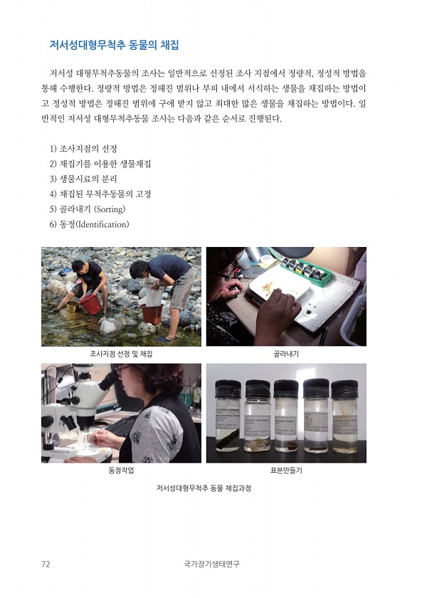 72 국가장기생태연구 저서성대형무척추 동물의 채집 저서성 대형무척추동물의 조사는 일반적으로 선정된 조사 지점에서 정량적, 정성적 방법을 통해 수행한다. 정량적 방법은 정해진 범위나 부피 내에서 서식하는 생물을 채집하는 방법이 고 정성적 방법은 정해진 범위에 구애 받지 않고 최대한 많은 생물을 채집하는 방법이다. 일 반적인 저서성 대형무척추동물 조사는 다음과 같은 순서로 진행된다. 1 조사지점의 선정 2 채집기를 이용한 생물채집 3 생물시료의 분리 4 채집된 무척추동물의 고정 5 골라내기 Sorting 6 동정 Identification 조사지점 선정 및 채집 동정작업 골라내기 표본만들기 저서성대형무척추 동물채집과정