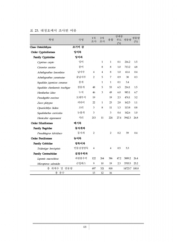 48 학명 국명 1차 조사 2차 조사 총합 상대풍 부도 % 생물량 생물량 % Class Osteichthyes 조기어 강 Order Cypriniformes 잉어목 Family Cyprinidae 잉어과 Cyprinus carpio 잉어 1 1 0.1 216.2 1.5 Carassius auratus 붕어 8 8 1.0 713.2 4.8 Acheilognathus lanceolatus 납자루 4 4 8 1.0 61.4 0.4 Acheilognathus yamatsutae 줄납자루 2 5 7 0.9 38 0.3 Squalidus japonicus coreanus 몰개 1 1 0.1 3.4 Squalidus chankaensis tsuchigae 참몰개 48 5 53 6.5 214.1 1.5 Hemibarbus...
