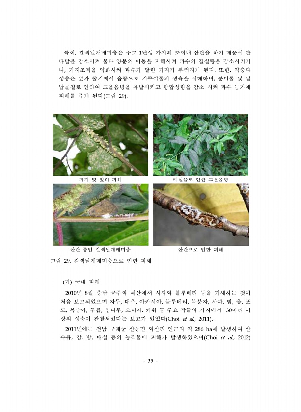 53 특히, 갈색날개매미충은 주로 1년생 가지의 조직내 산란을 하기 때문에 관 다발을 감소시켜 물과 양분의 이동을 저해시켜 과수의 결실량을 감소시키거 나, 가지조직을 약화시켜 과수가 달린 가지가 부러지게 된다. 또한, 약충과 성충은 잎과 줄기에서 흡즙으로 기주식물의 생육을 저해하며, 분비물 및 밀 납물질로 인하여 그을음병을 유발시키고 광합성량을 감소 시켜 과수 농가에 피해를 주게 된다 그림 29 가지 및 잎의 피해 배설물로 인한 그을음병 산란 중인 갈색날개매미충 산란으로 인한 피해 그림 29. 갈색날개매미충으로 인한 피해 가 국내 피해 2010년 8월 충남 공주와 예산에서 사과와 블루베리 등을 가해하는 것이 처음 보고되었으며 자두, 대추, 아카시아, 블루베리, 복분자, 사과, 밤, 옻, 포 도, 복숭아, 두...