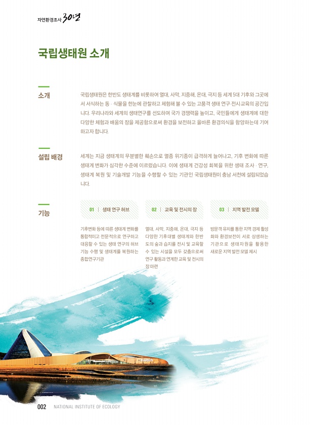 설립 배경 세계는 지금 생태계의 무분별한 훼손으로 멸종 위기종이 급격하게 늘어나고, 기후 변화에 따른 생태계 변화가 심각한 수준에 이르렀습니다. 이에 생태계 건강성 회복을 위한 생태 조사 · 연구, 생태계 복원 및 기술개발 기능을 수행할 수 있는 기관인 국립생태원이 충남 서천에 설립되었습 니다. 방문객 유치를 통한 지역 경제 활성 화와 환경보전이 서로 상생하는 기관으 로 생태자 원을 활용한 새로운 지역 발전 모델 제시 기능 열대, 사막, 지중해, 온대, 극지 등 다양한 기후대별 생태계와 한반 도의 숲과 습지를 전시 및 교육할 수 있는 시설을 모두 갖춤으로써 연구 활동과 연계한 교육 및 전시의 장 마련 기후변화 등에 따른 생태계 변화를 통합적이고 전문적으로 연구하고 대응할 수 있는 생태 연구의 허브 기능 수행...