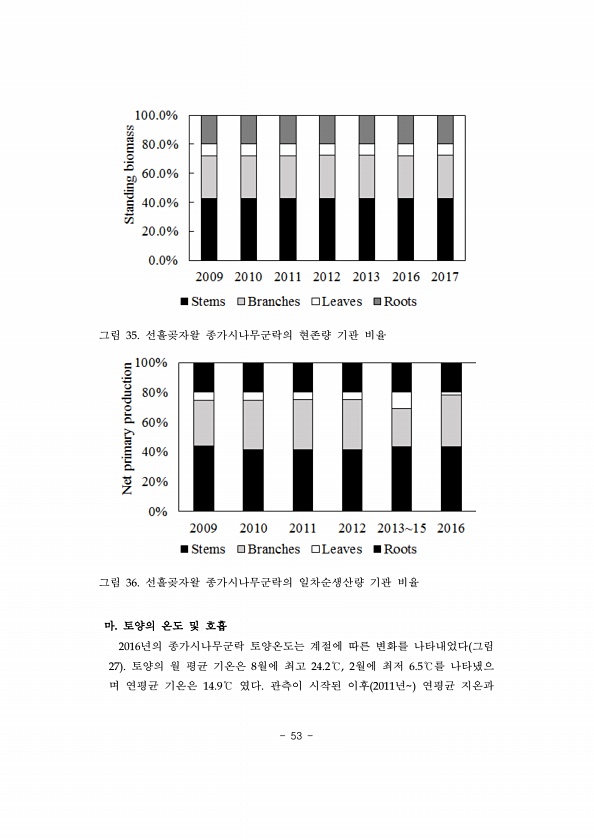 53 그림 35. 선흘곶자왈 종가시나무군락의 현존량 기관 비율 그림 36. 선흘곶자왈 종가시나무군락의 일차순생산량 기관 비율 마. 토양의 온도 및 호흡 2016년의 종가시나무군락 토양온도는 계절에 따른 변화를 나타내었다 그림 27 토양의 월 평균 기온은 8월에 최고 24.2℃, 2월에 최저 6.5℃를 나타냈으 며 연평균 기온은 14.9℃ 였다. 관측이 시작된 이후 2011년연평균지온과