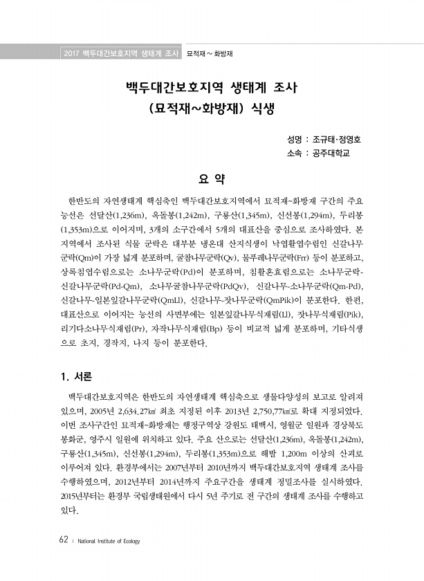 2017 백두대간보호지역 생태계 조사 묘적재 화방재 62 ? National Institute of Ecology 백두대간보호지역 생태계 조사 묘적재화방재 식생 성명 조규태·정영호 소속 공주대학교 요 약 한반도의 자연생태계 핵심축인 백두대간보호지역에서 묘적재화방재 구간의 주요 능선은 선달산 1,236m , 옥돌봉 1,242m , 구룡산 1,345m , 신선봉 1,294m , 두리봉 1,353m 으로 이어지며, 3개의 소구간에서 5개의 대표산을 중심으로 조사하였다. 본 지역에서 조사된 식물 군락은 대부분 냉온대 산지식생이 낙엽활엽수림인 신갈나무 군락 Qm 이 가장 넓게 분포하며, 굴참나무군락 Qv , 물푸레나무군락 Frr 등이 분포하고, 상록침엽수림으로는 소나무군락 Pd 이 분포하며, 침활혼효림으로는 소나무군...
