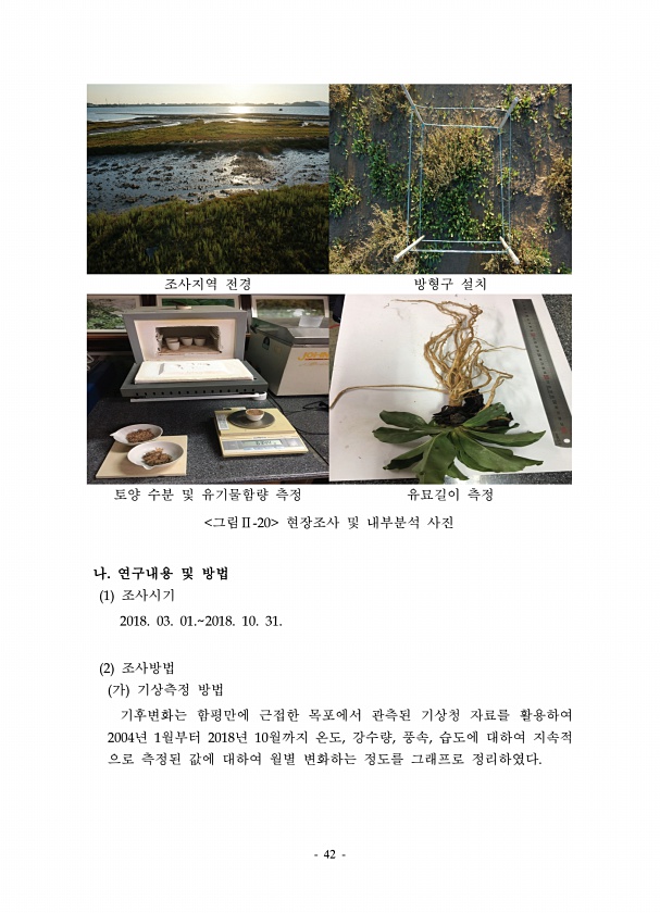 42 조사지역 전경 방형구 설치 토양 수분 및 유기물함량 측정 유묘길이 측정 그림Ⅱ-20 현장조사 및 내부분석 사진 나. 연구내용 및 방법 1 조사시기 2018. 03. 01.2018. 10. 31. 2 조사방법 가 기상측정 방법 기후변화는 함평만에 근접한 목포에서 관측된 기상청 자료를 활용하여 2004년 1월부터 2018년 10월까지 온도, 강수량, 풍속, 습도에 대하여 지속적 으로 측정된 값에 대하여 월별 변화하는 정도를 그래프로정리하였다.