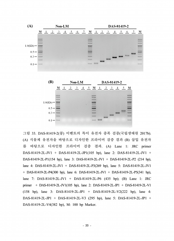 55 그림 33. DAS-81419-2 콩 이벤트의 특이 유전자 증폭 검증 국립생태원 2017b A 식물체 유전자을 바탕으로 디자인한 프라이머 검증 결과 B 삽입 유전자 를 바탕으로 디자인한 프라이머 검증 결과. A Lane 1JRC primer DAS-81419-2L-JV1 + DAS-81419-2L-JP1 105 bp , lane 2DAS-81419-2L-JV1 + DAS-81419-2L-P1 154 bp , lane 3DAS-81419-2L-JV1 + DAS-81419-2L-P2 214 bp , lane 4DAS-81419-2L-JV1 + DAS-81419-2L-P3 269 bp , lane 5DAS-81419-2L-JV1 + DAS-81419-2L-P4 300 bp , lane 6DAS-81419-2...