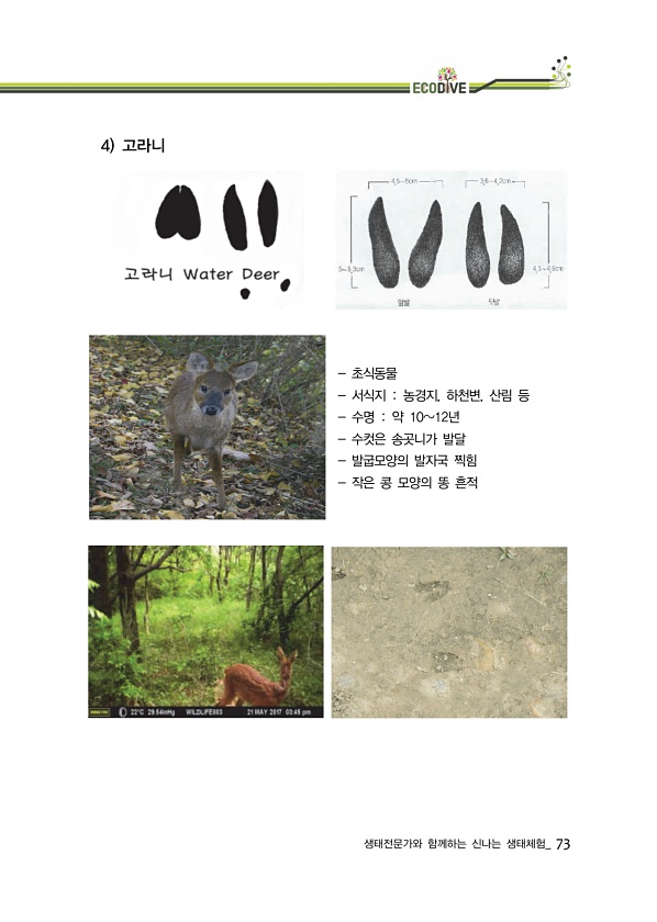 생태전문가와 함께하는 신나는 생태체험_ 73 4 고라니 초식동물 서식지 농경지, 하천변, 산림 등 수명 약 1012년 수컷은 송곳니가 발달 발굽모양의 발자국 찍힘 작은 콩 모양의 똥흔적