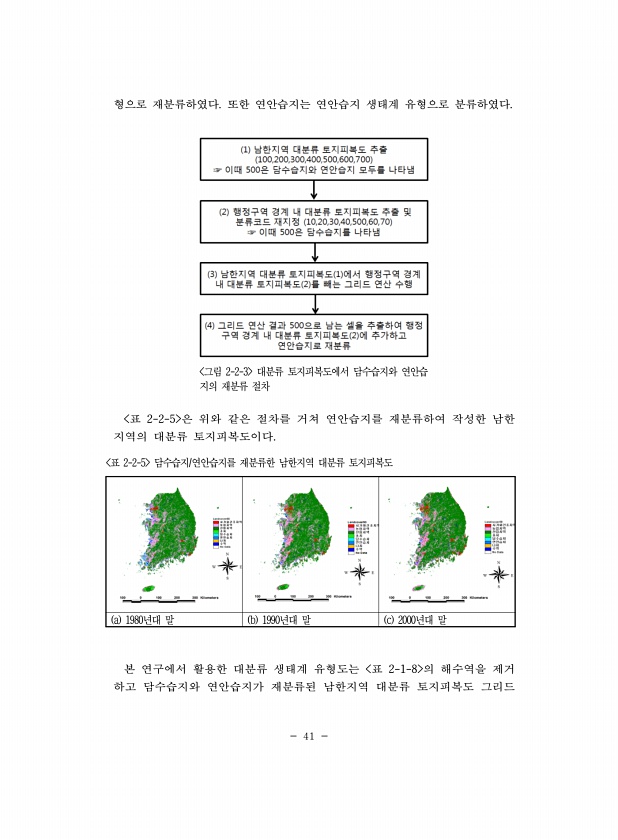 41 형으로 재분류하였다. 또한 연안습지는 연안습지 생태계 유형으로 분류하였다. 그림 2-2-3 대분류 토지피복도에서 담수습지와 연안습 지의 재분류 절차 표 2-2-5 은 위와 같은 절차를 거쳐 연안습지를 재분류하여 작성한 남한 지역의 대분류 토지피복도이다. a 1980년대 말 b 1990년대 말 c 2000년대 말 표 2-2-5 담수습지/연안습지를 재분류한 남한지역 대분류 토지피복도 본 연구에서 활용한 대분류 생태계 유형도는 표 2-1-8 의 해수역을 제거 하고 담수습지와 연안습지가 재분류된 남한지역 대분류 토지피복도그리드