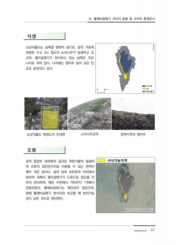 Ⅳ. 뿔제비갈매기 서식지 발굴 및 서식지 환경조사 www.nie.re.kr ? 61 식생 소낭각흘도는 남북향 형태의 섬으로, 섬의 가운데 부분은 수고 2m 정도의 소사나무가 밀생하고 있 으며, 괭이갈매기가 번식하고 있는 남쪽은 주로 나지로 되어 있다. 나지에는 명아주 등이 낮은 빈 도로 분포하고 있다. 소낭각흘도 특정도서 안내판 소사나무군락 암벽지역과 명아주 조류 섬의 중앙부 대부분의 공간은 목본식물이 밀생하 여 조류의 집단번식지로 이용할 수 있는 면적이 매우 적은 섬이다. 섬의 남측 초본류와 바위에서 800여 개체의 괭이갈매기가 드문드문 집단을 이 루어 번식하며, 해안 수면에서 가마우지 1개체가 관찰되었다. 뿔제비갈매기는 확인되지 않았으며, 현재 뿔제비갈매기 번식지와 비교할 때 번식가능 성이 낮은 것으로 ...
