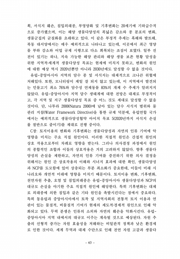 획, 서식지 훼손, 침입외래종, 부영양화 및 기후변화는 20세기에 기하급수적 으로 증가했으며, 이는 해양 생물다양성의 폭넓은 감소와 종 분포의 변화, 생물군집의 균질화를 초래하고 있다. 이 같은 부정적 추세는 흑해와 발트해, 북동 대서양에서는 매우 예외적으로 나타나고 있는데, 이곳에서 최근 영양 물 부하 감소와 어업 규제 시행으로 다소 회복되는 조짐이 보였다. 일부 진 전이 있기는 하나, 지속 가능한 해양 관리와 해양 생물 보존 현황 달성을 위한 지역적?세계적 생물다양성 목표는 현재에 미치지 못하고, 변화의 원인 에 대한 예상 역시 2020년뿐만 아니라 2030년에도 달성할 수 없을 것이다. 유럽-중앙아시아 지역의 담수 종 및 서식지는 대체적으로 크나큰 위협에 처해있다. 또한, 모니터링이 제일 잘 되지 않고...
