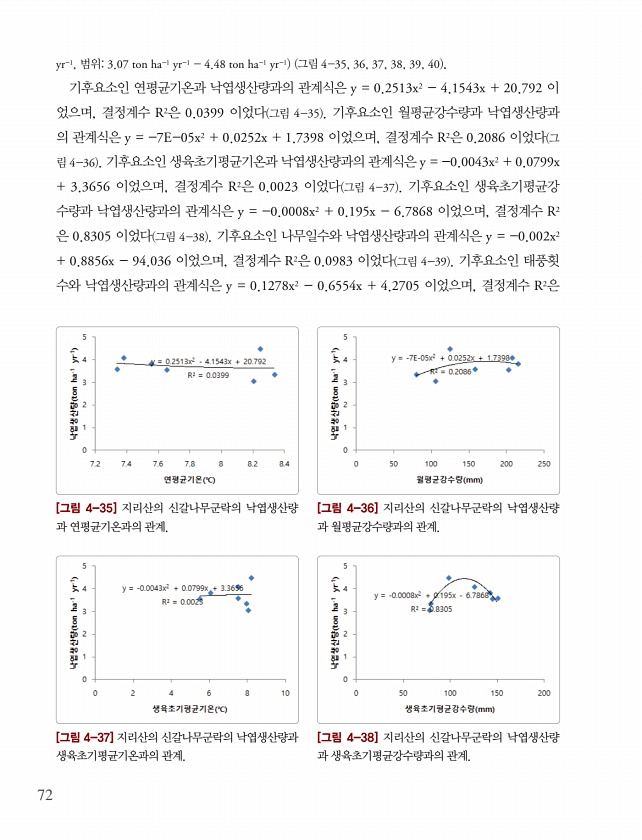 72 yr-1, 범위3.07 ton ha-1 yr-1 4.48 ton ha-1 yr-1 그림 4-35, 36, 37, 38, 39, 40 기후요소인 연평균기온과 낙엽생산량과의 관계식은 y = 0.2513x2 4.1543x + 20.792 이 었으며, 결정계수 R2은 0.0399 이었다 그림 4-35 기후요소인 월평균강수량과 낙엽생산량과 의 관계식은 y = -7E-05x2 + 0.0252x + 1.7398 이었으며, 결정계수 R2은 0.2086 이었다 그 림 4-36 기후요소인 생육초기평균기온과 낙엽생산량과의 관계식은 y = -0.0043x2 + 0.0799x + 3.3656 이었으며, 결정계수 R2은 0.0023 이었다 그림 4-37 기후요소인 생육초기평균강 수량과 낙엽생산량과의 관계식은 y = -0.000...