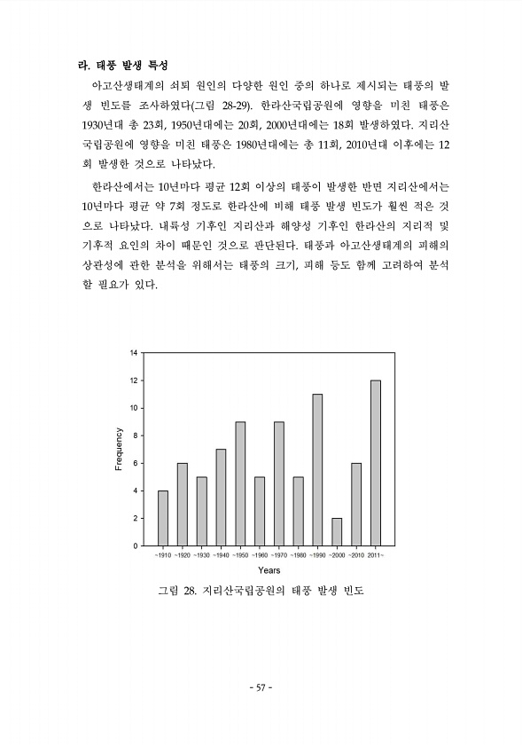 57 라. 태풍 발생 특성 아고산생태계의 쇠퇴 원인의 다양한 원인 중의 하나로 제시되는 태풍의 발 생 빈도를 조사하였다 그림 28-29 한라산국립공원에 영향을 미친 태풍은 1930년대 총 23회, 19J0년대에는 20회, 2000년대에는 18회 발생하였다. 지리산 국립공원에 영향을 미친 태풍은 1980년대에는 총 11회, 2010년대 이후에는 12 회 발생한 것으로 나타났다. 한라산에서는 10년마다 평균 12회 이상의 태풍이 발생한 반면 지리산에서는 10년마다 평균 약 7회 정도로 한라산에 비해 태풍 발생 빈도가 훨씬 적은 것 으로 나타났다. 내륙성 기후인 지리산과 해양성 기후인 한라산의 지리적 및 기후적 요인의 차이 때문인 것으로 판단된다. 태풍과 아고산생태계의 피해의 상관성에 관한 분석을 위해서는 태풍의...