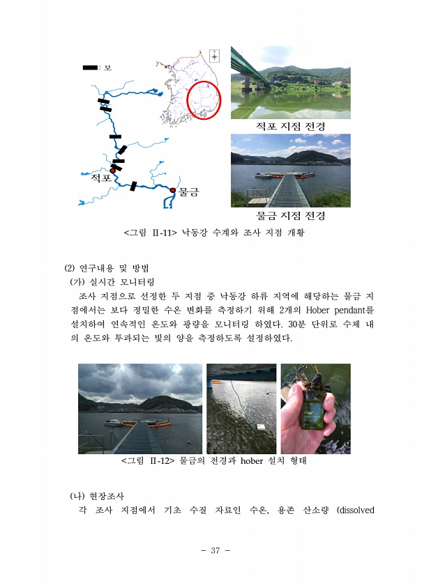37 그림 Ⅱ-11 낙동강 수계와 조사 지점 개황 2 연구내용 및 방법 가 실시간 모니터링 조사 지점으로 선정한 두 지점 중 낙동강 하류 지역에 해당하는 물금 지 점에서는 보다 정밀한 수온 변화를 측정하기 위해 2개의 Hober pendant를 설치하여 연속적인 온도와 광량을 모니터링 하였다. 30분 단위로 수체 내 의 온도와 투과되는 빛의 양을 측정하도록 설정하였다. 그림 Ⅱ-12 물금의 전경과 hober 설치 형태 나 현장조사 각 조사 지점에서 기초 수질 자료인 수온, 용존 산소량dissolved