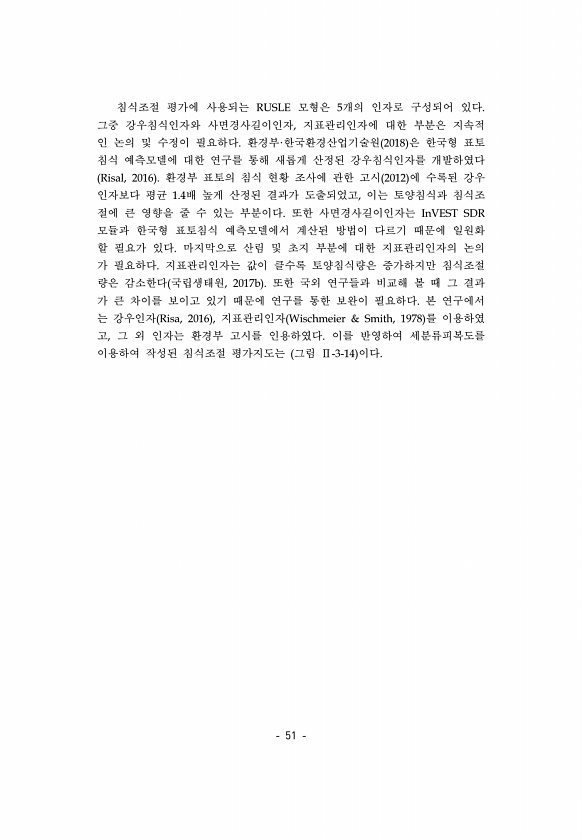 51 침식조절 평가에 사용되는 RUSLE 모형은 5개의 인자로 구성되어 있다. 그중 강우침식인자와 사면경사길이인자, 지표관리인자에 대한 부분은 지속적 인 논의 및 수정이 필요하다. 환경부·한국환경산업기술원 2018 은 한국형 표토 침식 예측모델에 대한 연구를 통해 새롭게 산정된 강우침식인자를 개발하였다 Risal, 2016 환경부 표토의 침식 현황 조사에 관한 고시 2012 에 수록된 강우 인자보다 평균 1.4배 높게 산정된 결과가 도출되었고, 이는 토양침식과 침식조 절에 큰 영향을 줄 수 있는 부분이다. 또한 사면경사길이인자는 InVEST SDR 모듈과 한국형 표토침식 예측모델에서 계산된 방법이 다르기 때문에 일원화 할 필요가 있다. 마지막으로 산림 및 초지 부분에 대한 지표관리인자의 논의 가 필요하다. ...