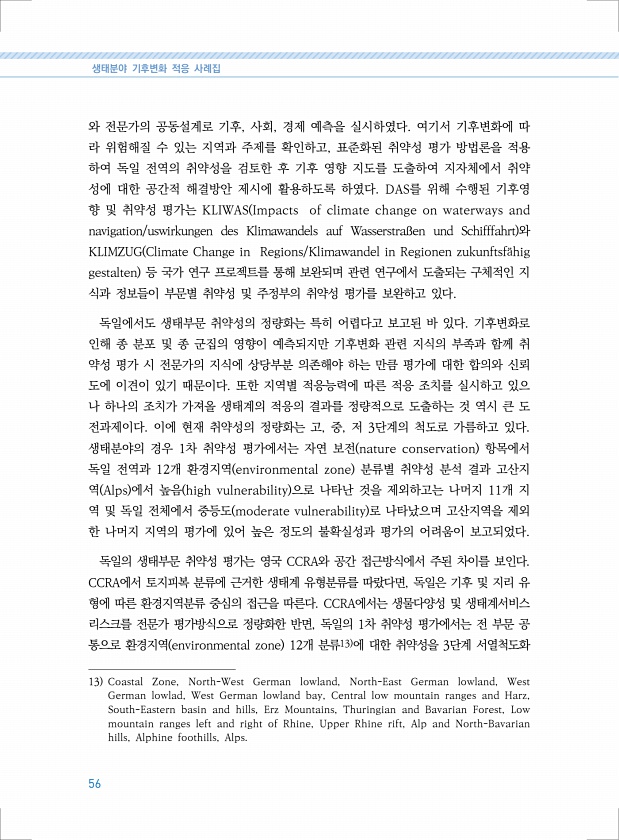 생태분야 기후변화 적응 사례집 56 와 전문가의 공동설계로 기후, 사회, 경제 예측을 실시하였다. 여기서 기후변화에 따 라 위험해질 수 있는 지역과 주제를 확인하고, 표준화된 취약성 평가 방법론을 적용 하여 독일 전역의 취약성을 검토한 후 기후 영향 지도를 도출하여 지자체에서 취약 성에 대한 공간적 해결방안 제시에 활용하도록 하였다. DAS를 위해 수행된 기후영 향 및 취약성 평가는 KLIWAS Impacts of climate change on waterways and navigation/uswirkungen des Klimawandels auf Wasserstraßen und Schifffahrt 와 KLIMZUG Climate Change in Regions/Klimawandel in Regionen ...