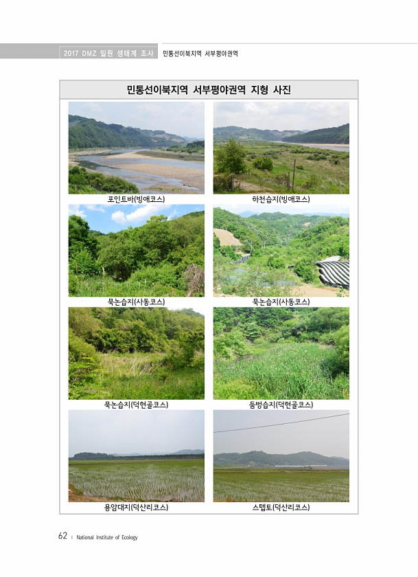 2017 DMZ 일원 생태계 조사 민통선이북지역 서부평야권역 62 ? National Institute of Ecology 민통선이북지역 서부평야권역 지형 사진 포인트바 빙애코스 하천습지 빙애코스 묵논습지 사동코스 묵논습지 사동코스 묵논습지 덕현골코스 둠벙습지 덕현골코스 용암대지 덕산리코스 스텝토 덕산리코스
