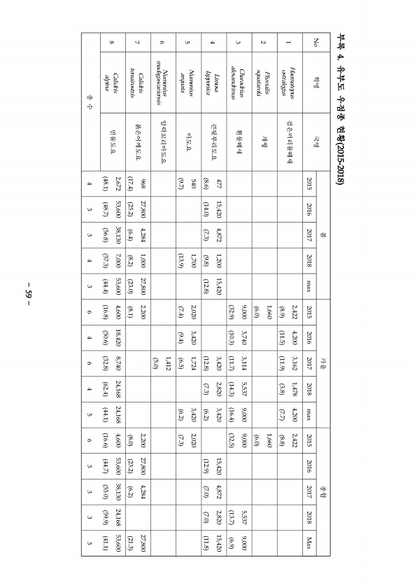 No 학명 국명 봄 가을 종합 2015 2016 2017 2018 max 2015 2016 2017 2018 max 2015 2016 2017 2018 Max 1 Haematopus ostralegus 검은머리물떼새 2,422 4,200 3,162 1,478 4,200 2,422 8.9 11.5 11.9 3.8 7.7 8.8 2 Pluvialis squatarola 개꿩 1,660 1,660 6.0 6.0 3 Charadrius alexandrinus 흰물떼새 9,000 3,740 3,114 5,537 9,000 9,000 5,537 9,000 32.9 10.3 11.7 14.3 16.4 32.5 13.7 6.9 4 Limosa lapponica 큰뒷부리도요 477 15,420 4,872 1,200 15,4...