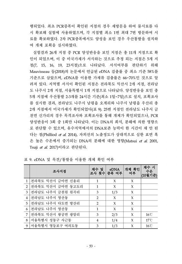 53 행되었다. 최초 PCR증폭이 확인된 지점의 경우 재방문을 하여 물시료를 다 시 확보해 실험에 사용하였으며, 각 지점별 최소 1번 최대 7번 방문하여 시 료를 확보하였다. 2차 PCR증폭에서도 양성을 보인 경우 우산통발을 설치하 여 개체 포획을 실시하였다. 실험결과 26개 지점 중 PCR 양성반응을 보인 지점은 총 11개 지점으로 확 인이 되었으며, 이 중 미국가재가 서식하는 것으로 추정 되는 지점은 5개 지 점 7, 15, 16, 19, 23지점 으로 나타났다. 서식여부를 판단하기 위해 Mauvisseau 등 2018 의 논문에서 언급된 eDNA 검출률 중 최소 기준 58%를 기준으로 삼았으며, eDNA를 이용한 가재류 검출률은 6670%인 것으로 알 려져 있다. 지역별 서식이 확인된 지점은 전라북도 ...