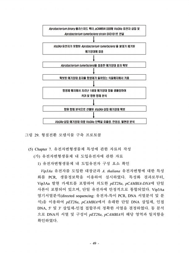 49 그림 29. 형질전환 모델식물 구축 프로토콜 5 Chapter 7. 유전자변형생물체 특성에 관한 자료의 작성 가 유전자변형생물체 내 도입유전자에 관한 자료 1 유전자변형생물체 내 도입유전자 구성 요소 확인 Vip3Aa 유전자를 도입한 대장균과 A. thaliana 유전자변형에 대한 특성 화를 PCR, 생물정보학을 이용하여 실시하였다. 특성화 결과로부터, Vip3Aa 발현 카세트를 포함하여 의도한 pET28a, pCAMBIA-DNA에 단일 사본이 포함되어 있으며, 단일 유전자에 안정적으로 통합되었다. Vip3Aa 염기서열분석 directed sequencing유전자-특이 PCR, DNA 서열분석 및 분 석 을 이용하여 pET28a, pCAMBIA에서 유래한 단일 DNA 삽입체, 인접 DNA, 5및 3삽입...