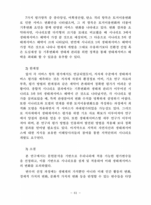 61 7가지 평가항목 중 종다양성, 어획생산량, 탄소 격리 항목은 토지이용변화 로 인한 서비스 변화만을 나타냈으며, 그 외 항목은 토지이용변화와 더불어 기후변화 요인을 함께 반영된 서비스 변화를 나타내고 있다. 변화 결과를 요 약하자면, 시나리오별 다각형의 크기를 토대로 비교했을 때 시나리오 3에서 생태계서비스 혜택이 가장 클 것으로 예상되며, 그 다음으로 시나리오 5의 생 태계서비스 혜택이 크게 나타났다. 반면에 시나리오 1의 생태계서비스 혜택이 가장 적은 것으로 나타나 현재의 개발을 그대로 수용하기보다 친환경 산업 혹 은 도심재생 등 기후변화와 생태계 관리를 위한 정책을 통해 생태계서비스 혜 택을 최대화 할 수 있음을 유추할 수 있다. 2 한계점 앞서 각 서비스 항목 평가에서도 언급되었듯이, 지자체 수준...