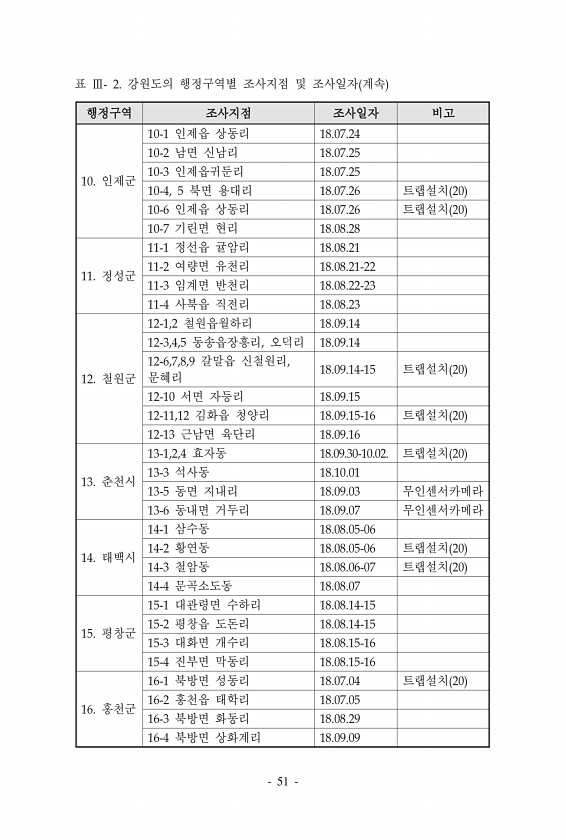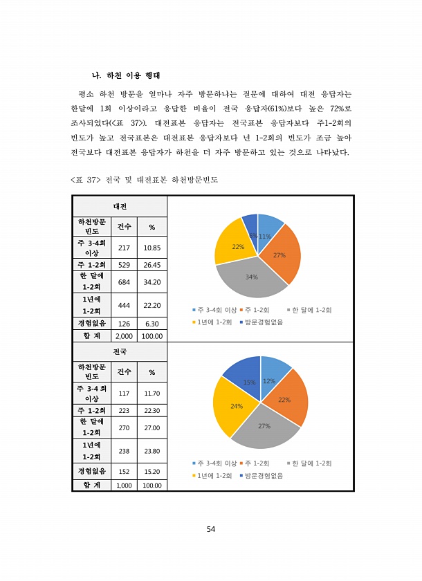 54 나. 하천 이용 행태 평소 하천 방문을 얼마나 자주 방문하냐는 질문에 대하여 대전 응답자는 한달에 1회 이상이라고 응답한 비율이 전국 응답자 61% 보다 높은 72%로 조사되었다 표 37 대전표본 응답자는 전국표본 응답자보다 주1-2회의 빈도가 높고 전국표본은 대전표본 응답자보다 년 1-2회의 빈도가 조금 높아 전국보다 대전표본 응답자가 하천을 더 자주 방문하고 있는 것으로 나타났다. 표 37 전국 및 대전표본 하천방문빈도 대전 하천방문 빈도 건수 % 주 3-4회 이상 217 10.85 주 1-2회 529 26.45 한 달에 1-2회 684 34.20 1년에 1-2회 444 22.20 경험없음 126 6.30 합 계 2,000 100.00 전국 하천방문 빈도 건수 % 주 3-4 회 이상 117 11.7...