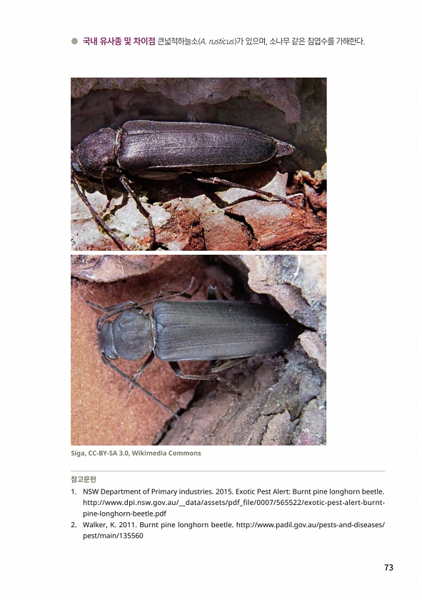 73 ● 국내 유사종 및 차이점 큰넓적하늘소 A. rusticus 가 있으며, 소나무 같은 침엽수를 가해한다. 참고문헌 1. NSW Department of Primary industries. 2015. Exotic Pest AlertBurnt pine longhorn beetle. http//www.dpi.nsw.gov.au/__data/assets/pdf_file/0007/565522/exotic-pest-alert-burntpine-longhorn-beetle.pdf 2. Walker, K. 2011. Burnt pine longhorn beetle. http//www.padil.gov.au/pests-and-diseases/ pest/main/135560 Jim Moore, Centre for Bio...