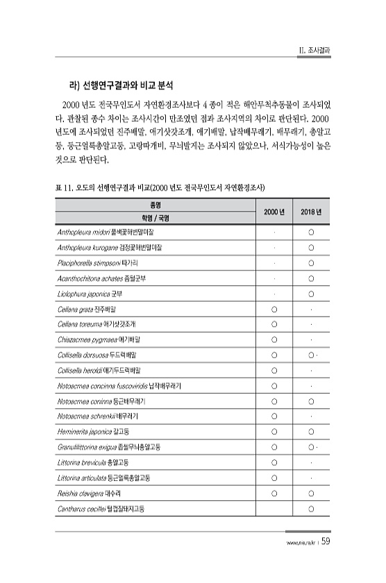 II. 조사결과 www.nie.re.kr ? 59 2000 년도 전국무인도서 자연환경조사보다 4 종이 적은 해안무척추동물이 조사되었 다. 관찰된 종수 차이는 조사시간이 만조였던 점과 조사지역의 차이로 판단된다. 2000 년도에 조사되었던 진주배말, 애기삿갓조개, 애기배말, 납작배무래기, 배무래기, 총알고 둥, 둥근얼룩총알고둥, 고랑따개비, 무늬발게는 조사되지 않았으나, 서식가능성이 높은 것으로 판단된다. 종명 2000 년 2018 년 학명 국명 Anthopleura midori 풀색꽃해변말미잘 ○ Anthopleura kurogane 검정꽃해변말미잘 ○ Placiphorella stimpsoni 따가리 ○ Acanthochitona achates 좀털군부 ○ Liolophura japonica 군...