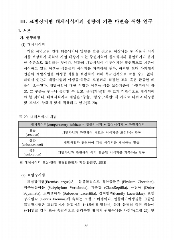 III. ? 1. 1 ? ? ? ? ? · · ? · ? · ? , ? ? , ‘ ’, ‘ ’, ‘ ’ ? 20 compensatory habitat = + + creation enhancement ? restoration 20. ※ 대체서식지 조성·관리 환경영향평가 지침 환경부, 2013 2 Eremias argus Phylum Chordata , Subphylum Vertebrata , ClassReptilia , Order Squamata , Suborder Lacertilia , Family Lacertidae , Genus Eremias ? Ⅱ? ? ? ? 11.5 , 814 ? 25