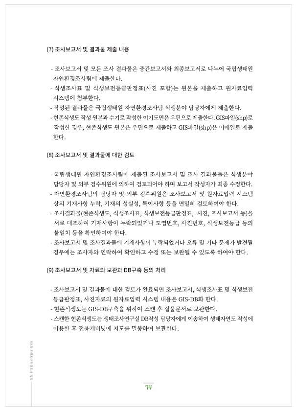 74 제5차 전국자연환경조사 지침 7 조사보고서?및?결과물?제출?내용 조사보고서?및?모든?조사?결과물은?중간보고서와?최종보고서로?나누어?국립생태원 자연환경조사팀에?제출한다. 식생조사표?및?식생보전등급판정표 사진?포함 는?원본을?제출하고?원자료입력 시스템에?첨부한다. 작성된?결과물은?국립생태원?자연환경조사팀?식생분야?담당자에게?제출한다. 현존식생도?작성?원본과?수기로?작성한?이기도면은?우편으로?제출한다. GIS파일 shp 로 작성한?경우, 현존식생도?원본은?우편으로?제출하고 GIS파일 shp 은?이메일로?제출 한다. 8 조사보고서?및?결과물에?대한?검토 국립생태원?자연환경조사팀에?제출된?조사보고서?및?조사?결과물들은?식생분야 담당자?및?외부?검수위원에?의하여?검토되어야?하며?보고서?작성자가?최종?수정한다. 자...