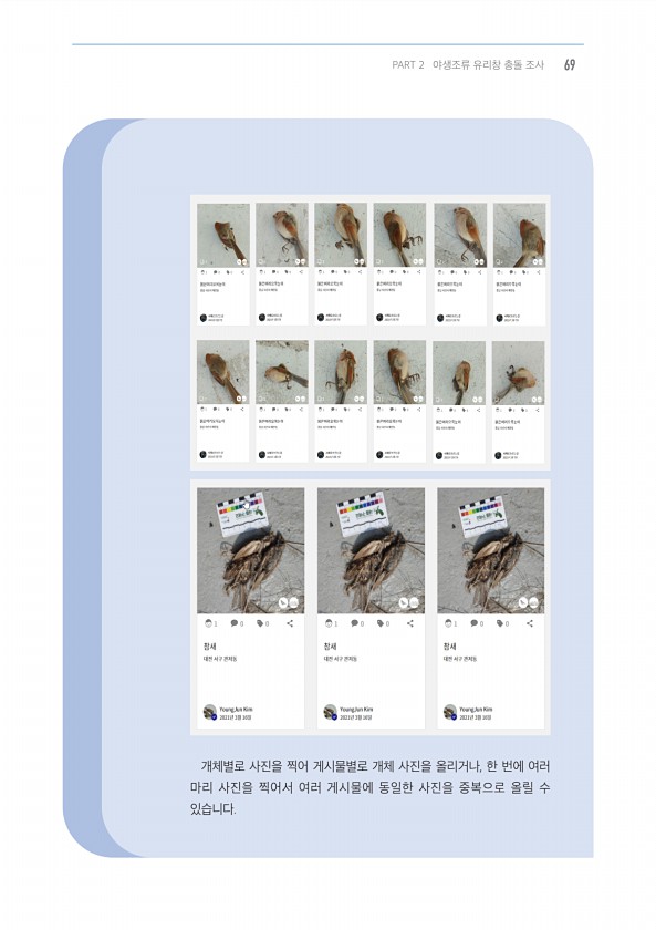 개체별로 사진을 찍어 게시물별로 개체 사진을 올리거나, 한 번에 여러 마리 사진을 찍어서 여러 게시물에 동일한 사진을 중복으로 올릴 수 있습니다. PART 2 야생조류 유리창 충돌 조사69