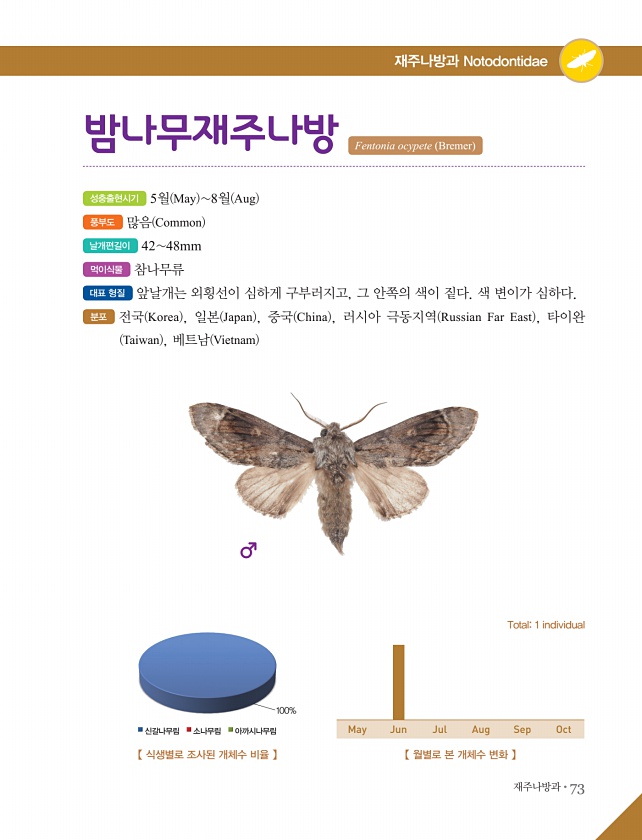 재주나방과?73 재주나방과 Notodontidae 성충출현시기 5월 May 8월 Aug 풍부도 많음 Common 날개편길이 4248mm 먹이식물 참나무류 대표 형질 앞날개는 외횡선이 심하게 구부러지고, 그 안쪽의 색이 짙다. 색 변이가 심하다. 분포 전국 Korea , 일본 Japan , 중국 China , 러시아 극동지역 Russian Far East , 타이완 Taiwan , 베트남 Vietnam 밤나무재주나방 Fentonia ocypete Bremer 【 월별로 본 개체수 변화 】 Total1 individual 【 식생별로 조사된 개체수 비율 】 100% 신갈나무림 소나무림 아까시나무림 May Jun Jul Aug SepOct