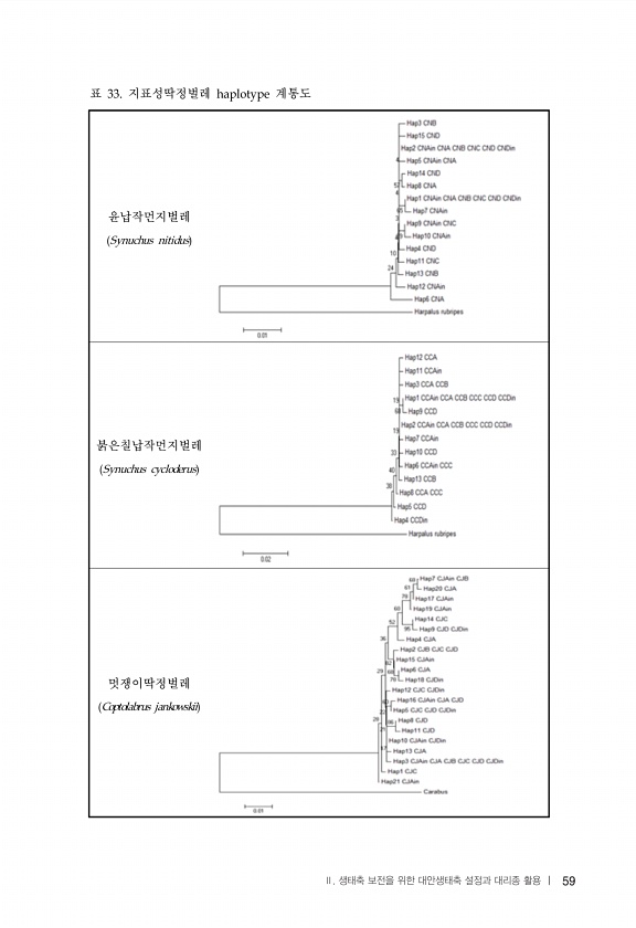 59 윤납작먼지벌레 붉은칠납작먼지벌레 멋쟁이딱정벌레 표 지표성딱정벌레 계통도 Ⅱ. 생태축 보전을 위한 대안생태축 설정과 대리종 활용 |59