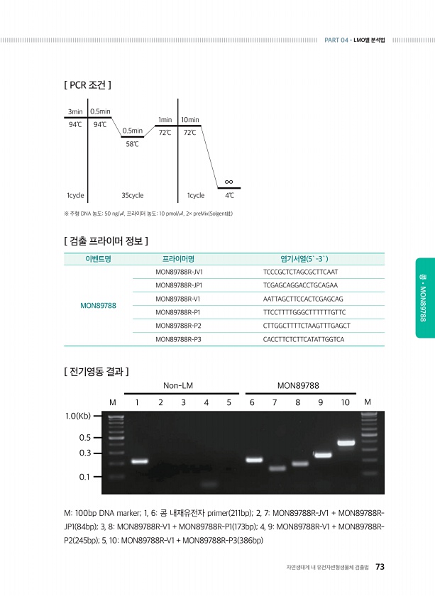 자연생태계 내 유전자변형생물체 검출법 73 PART 04?LMO별 분석법 콩?MON89788 [ 검출 프라이머 정보 ] 이벤트명 프라이머명 염기서열 5`-3` MON89788 MON89788R-JV1 TCCCGCTCTAGCGCTTCAAT MON89788R-JP1 TCGAGCAGGACCTGCAGAA MON89788R-V1 AATTAGCTTCCACTCGAGCAG MON89788R-P1 TTCCTTTTGGGCTTTTTTGTTC MON89788R-P2 CTTGGCTTTTCTAAGTTTGAGCT MON89788R-P3 CACCTTCTCTTCATATTGGTCA M100bp DNA marker; 1, 6콩 내재유전자 primer 211bp ; 2, 7MON89788R-JV1 + MON89788RJP1 84bp ; 3, ...