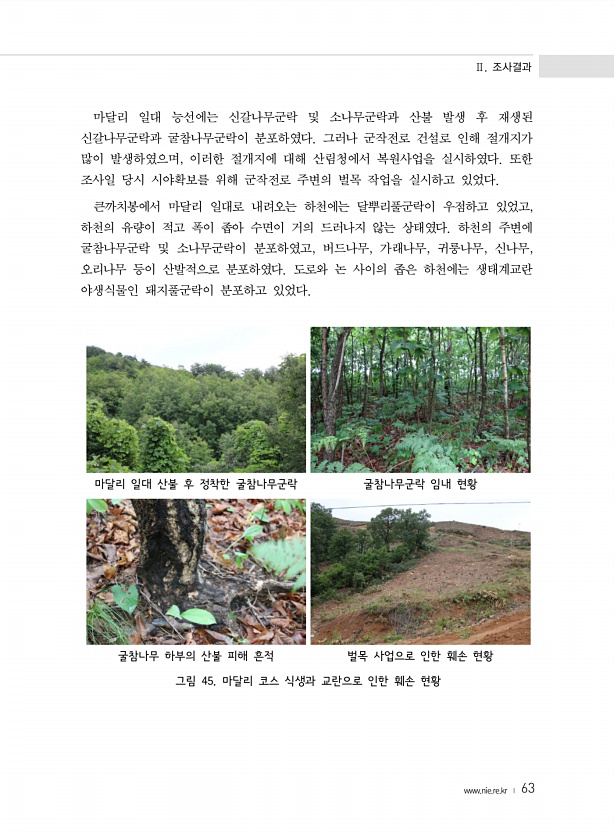 Ⅱ. 조사결과 www.nie.re.kr ? 63 마달리 일대 능선에는 신갈나무군락 및 소나무군락과 산불 발생 후 재생된 신갈나무군락과 굴참나무군락이 분포하였다. 그러나 군작전로 건설로 인해 절개지가 많이 발생하였으며, 이러한 절개지에 대해 산림청에서 복원사업을 실시하였다. 또한 조사일 당시 시야확보를 위해 군작전로 주변의 벌목 작업을 실시하고 있었다. 큰까치봉에서 마달리 일대로 내려오는 하천에는 달뿌리풀군락이 우점하고 있었고, 하천의 유량이 적고 폭이 좁아 수면이 거의 드러나지 않는 상태였다. 하천의 주변에 굴참나무군락 및 소나무군락이 분포하였고, 버드나무, 가래나무, 귀룽나무, 신나무, 오리나무 등이 산발적으로 분포하였다. 도로와 논 사이의 좁은 하천에는 생태계교란 야생식물인 돼지풀군락이 분포하고 있었다....