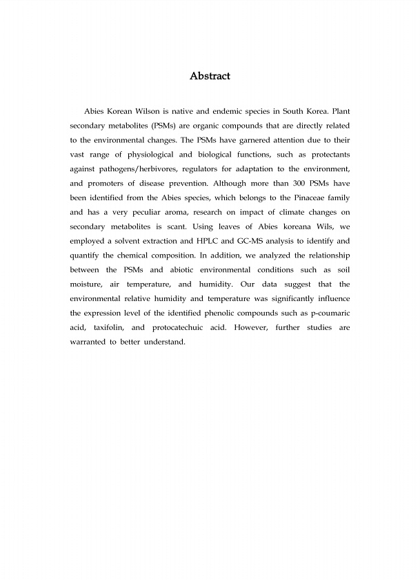 Abstract Abies Korean Wilson is native and endemic species in South Korea. Plant secondary metabolites PSMs are organic compounds that are directly related to the environmental changes. The PSMs have garnered attention due to their vast range of physiological and biological functions, such as protectants against pathogens/herbivores, regulators for adaptation to the environment, and promoters of d...