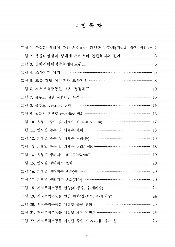 vi 그 림 목 차 그림 1. 수심과 서식에 따라 서식하는 다양한 바다새 미국의 습지 사례 ·· 2 그림 2. 생물다양성의 생태계 서비스와 인관복리의 관계 ······························ 3 그림 3. 동아시아대양주철새네트워크 ·································································· 5 그림 4. 조사지역 위치 ···························································································· 5 그림 5. 조류 갯벌 이용현황 조사지점 ····························································...