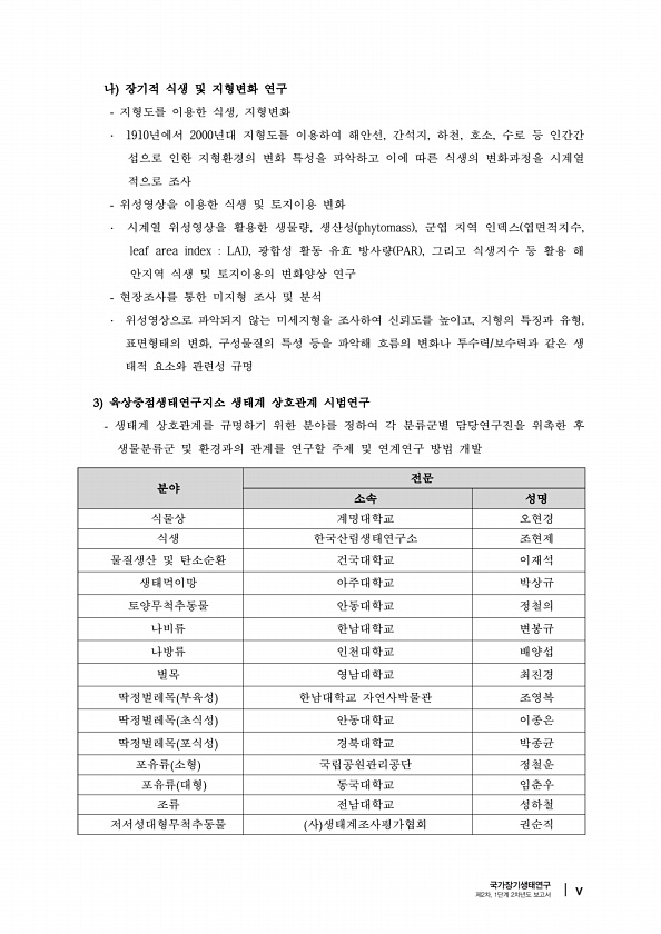 분야 전문 소속 성명 식물상 계명대학교 오현경 식생 한국산림생태연구소 조현제 물질생산 및 탄소순환 건국대학교 이재석 생태먹이망 아주대학교 박상규 토양무척추동물 안동대학교 정철의 나비류 한남대학교 변봉규 나방류 인천대학교 배양섭 벌목 영남대학교 최진경 딱정벌레목 부육성 한남대학교 자연사박물관 조영복 딱정벌레목 초식성 안동대학교 이종은 딱정벌레목 포식성 경북대학교 박종균 포유류 소형 국립공원관리공단 정철운 포유류 대형 동국대학교 임춘우 조류 전남대학교 성하철 저서성대형무척추동물 사 생태계조사평가협회 권순직 나 장기적 식생 및 지형변화 연구 지형도를 이용한 식생 지형변화 ? 1910년에서 2000년대 지형도를 이용하여 해안선, 간석지, 하천, 호소, 수로 등 인간간 섭으로 인한 지형환경의 변화 특성을 파악하고 이...