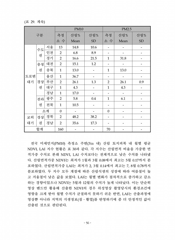 56 구분 측정 소 수 산림 산림 측정 소 수 산림 산림 도로변 대기 수도 권 서울 인천 경기 충청 권 대전 충북 경상 권 울산 부산 대구 경남 전라 권 광주 전북 소계 교외 대기 경상 권 경북 경남 합계 표 계속 전국 미세먼지 측정소 주변 내 산림 토지피복 내 월별 평균 지수 현황은 표 과 같다 각 지수는 산림면적 비율을 가중한 면 적가중 수치로 본래 수치보다는 전체적으로 낮은 수치를 나타냈 다 산림면적가중 는 최저가 월과 월 에서 최고는 월 까지 분 포하였다 산림면적가중 는 최저가 월 에서 최고는 월 까지 분포하였다 두 지수 모두 계절에 따른 산림식생의 성장에 따라 여름철이 높 고 겨울철이 낮은 값을 보였다 는 월별 변화가 점차적으로 증가하고 감소 하는 경향이었으나 는 월과 월의 수치가 높게 나타났다 이...