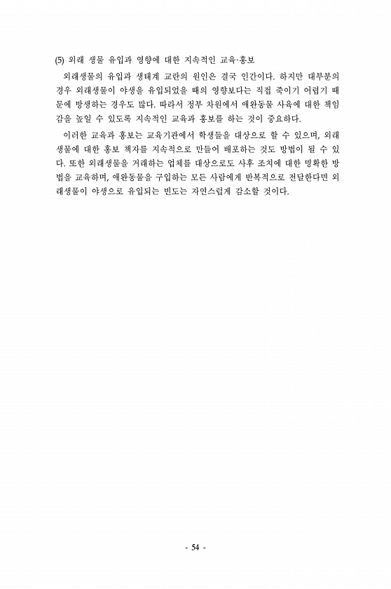 54 5 외래 생물 유입과 영향에 대한 지속적인 교육·홍보 외래생물의 유입과 생태계 교란의 원인은 결국 인간이다. 하지만 대부분의 경우 외래생물이 야생을 유입되었을 때의 영향보다는 직접 죽이기 어렵기 때 문에 방생하는 경우도 많다. 따라서 정부 차원에서 애완동물 사육에 대한 책임 감을 높일 수 있도록 지속적인 교육과 홍보를 하는 것이 중요하다. 이러한 교육과 홍보는 교육기관에서 학생들을 대상으로 할 수 있으며, 외래 생물에 대한 홍보 책자를 지속적으로 만들어 배포하는 것도 방법이 될 수 있 다. 또한 외래생물을 거래하는 업체를 대상으로도 사후 조치에 대한 명확한 방 법을 교육하며, 애완동물을 구입하는 모든 사람에게 반복적으로 전달한다면 외 래생물이 야생으로 유입되는 빈도는 자연스럽게 감소할것이다.