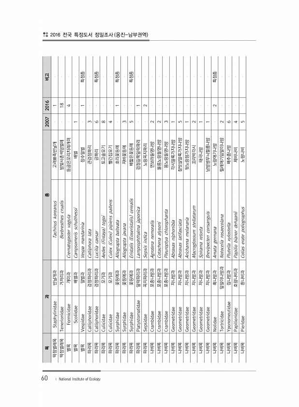 60 목 과 종 2007 2016 비고 딱정벌레목 Staphylinidae 반날개과 Tachinus koreanus 고려뾰족반날개 1 딱정벌레목 Tenerionidae 거저리과 Borbresthes crualis 밤빛사촌썩덩벌레 18 벌목 Formicidae 개미과 Crematogaster vagula 등굽은꼬리치레개미 4 벌목 Scoliidae 배벌과 Campsomeris schulthessi 배벌 1 벌목 Vespidae 말벌과 Vespa mandarinia 장수말벌 1 특정종 파리목 Calliphoridae 검정파리과 Calliphora lata 큰검정파리 3 파리목 Calliphoridae 검정파리과 Lucilia caesar 금파리 6 특정종 파리목 Cul...