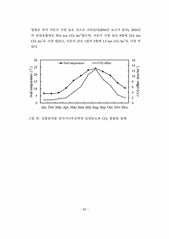 54 월평균 최저 지온이 가장 높은 것으로 나타났다 2016년 보고서 참조 2016년 의 토양호흡량은 59.6 ton CO2 ha-1였으며, 지온이 가장 높은 8월에 12.6 ton CO2 ha-1로 가장 많았고, 지온이 낮은 1월과 2월에 1.2 ton CO2 ha-1로 가장 적 었다. 그림 37. 선흘곶자왈 종가시나무군락의 토양온도와 CO2 방출량동태