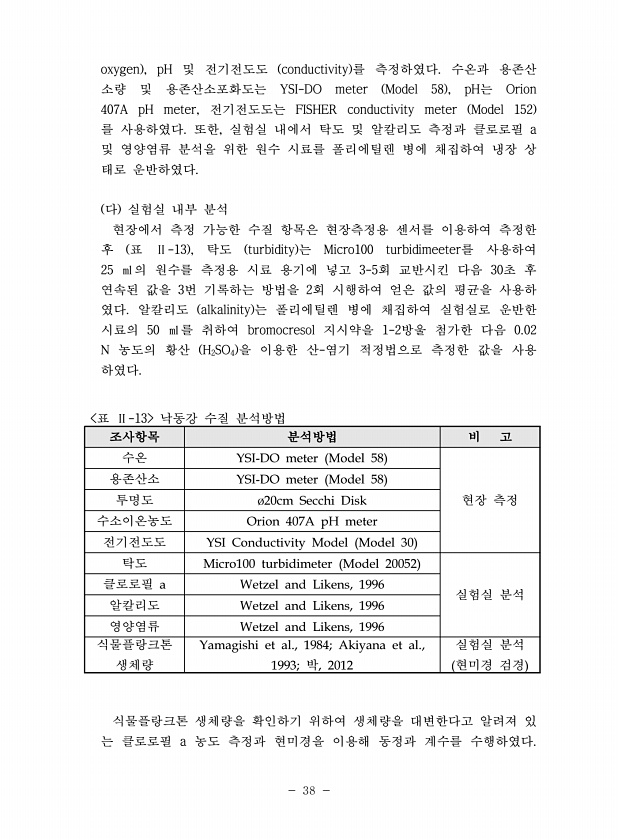 38 oxygen , pH 및 전기전도도 conductivity 를 측정하였다. 수온과 용존산 소량 및 용존산소포화도는 YSI-DO meter Model 58 , pH는 Orion 407A pH meter, 전기전도도는 FISHER conductivity meter Model 152 를 사용하였다. 또한, 실험실 내에서 탁도 및 알칼리도 측정과 클로로필 a 및 영양염류 분석을 위한 원수 시료를 폴리에틸렌 병에 채집하여 냉장 상 태로 운반하였다. 다 실험실 내부 분석 현장에서 측정 가능한 수질 항목은 현장측정용 센서를 이용하여 측정한 후 표 Ⅱ-13 , 탁도 turbidity 는 Micro100 turbidimeeter를 사용하여 25 ㎖의 원수를 측정용 시료 용기에 넣고 3-5회 교반시킨 다음 30초 후 연...