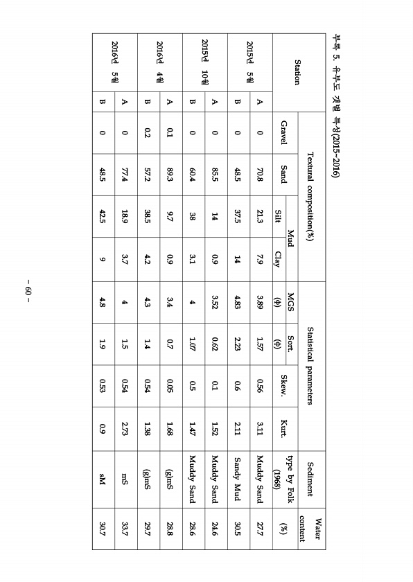 Station Textural composition % Statistical parameters Sediment Water content Gravel Sand Mud MGS Sort. Skew. Kurt. type by Folk 1968 % Silt Clay φ φ 2015년 5월 A 0 70.8 21.3 7.9 3.89 1.57 0.56 3.11 Muddy Sand 27.7 B 0 48.5 37.5 14 4.83 2.23 0.6 2.11 Sandy Mud 30.5 2015년 10월 A 0 85.5 14 0.9 3.52 0.62 0.1 1.52 Muddy Sand 24.6 B 0 60.4 38 3.1 4 1.07 0.5 1.47 Muddy Sand 28.6 2016년 4월 A 0.1 89.3 9.7 0.9 ...