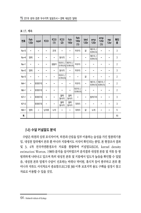 2018 생태·경관 우수지역 발굴조사 경북 내성천 일대 64 ? National Institute of Ecology 번호 fish 12Sr cypri fCOI fCOI 1 fCOI 2 16Sr fish 16Sr fish 1 bird 12Sr amp 12Sr amp 12Sr 1 rep 12sr 확인 종 Ns-3 끄리 미꾸리 닭 미꾸리 미꾸라지 3 Ns-4 잉어 동사리 미꾸리 미꾸라지 3 No-1 참붕어 미꾸리 미꾸라지 미꾸리 미꾸라지 미꾸리 2 No-2 잉어 동사리 미꾸리 3 No-3 미꾸리 미꾸라지 닭 2 N4-1 모래무지 미꾸리 미꾸리 미꾸라지 미꾸리 미꾸라지 2 N6-1 모래무지 미꾸리 미꾸라지 2 N7-1 모래무지 얼룩 동사리 얼룩 동사리 참개구리 3 N7-2 모래무지 얼룩 동사리 얼룩 동사리 피라미...