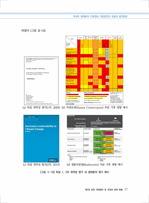 국내외 생태분야 기후변화 적응방안의 흐름과 발전방향 제2장 관련 국제협약 및 국내외 정책 현황 57 하였다 그림 Ⅱ?10 a 독일 취약성 평가 1차, 2005 b 자연보전 Nature Conservation 부문 기후 영향 예시 c 독일 취약성 평가 2차, 2015 d 생물다양성 Biodiversity 부문 기후 영향 예시 [그림 Ⅱ-10] 독일 1, 2차 취약성 평가 내 생태분야 평가예시