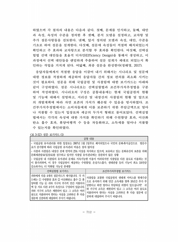 712 하였으며 각 절차의 내용은 다음과 같다. 첫째, 문제를 인식하고, 둘째, 대안 과 속성, 속성의 수준을 정의한 후 셋째, 분석 모델을 설정하고, 교차항 및 추가 질문사항들을 검토한다. 넷째, 앞서 정의된 모델과 속성, 대안, 수준을 기초로 하여 설문을 설계한다. 다섯째, 설문에 속성들이 적절히 배치되었는지 확인하고 주 효과와 교차항으로 분석할 부 효과를 확인한다. 여섯째, 선택실 험법 선택 대안들을 효율적 디자인 Efficiency Design 을 통해서 생성하고, 이 과정에서 선택 대안들을 랜덤하게 추출하여 설문 설계가 제대로 되었는지 확 인하는 작업을 거치게 된다. 여덟째, 최종 설문을 완성한다 정해영, 2017 응답자들에게서 적절한 응답을 이끌어 내기 위해서는 시나리오 및 설문에 대한 정보를 적...
