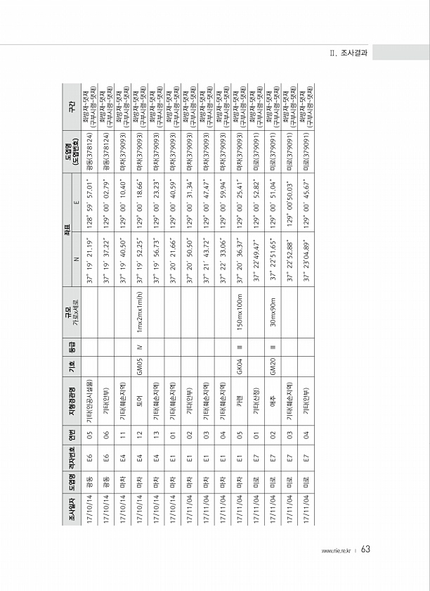 63 조사일자 도엽명 격자번호 연번 지형경관명 기호 등급 규모 가로x세로 좌표 도엽명 N E 도엽번호 구간 17/10/14 광동 E6 05 기타 인공시설물 37°19′21.19″ 128°59′57.01″ 광동 378124 화방재댓재 구부시령댓재 17/10/14 광동 E6 06 기타 안부 37°19′37.22″ 129°00′02.79″ 광동 378124 화방재댓재 구부시령댓재 17/10/14 마차 E4 11 기타 훼손지역 37°19′40.50″ 129°00′10.40″ 마차 379093 화방재댓재 구부시령댓재 17/10/14 마차 E4 12 토어 GM05 Ⅳ 1mx2mx1m h 37°19′52.25″ 129°00′18.66″ 마차 379093 화방재댓재 구부시령댓재 17/10/14 마차 E4 13 기타 훼손지...