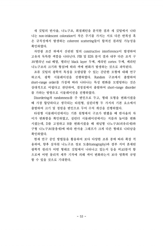 53 새 깃털의 반사율, 나노구조, 회절패턴을 분석한 결과 새 깃털에서 나타 나는 non-iridescent coloration이 작은 주기를 가지는 서로 다른 반복성 혹 은 규칙성에서 발생하는 coherent scattering들이 합쳐진 결과일 가능성을 확인하였다. 자연광 조건 하에서 산란된 빛의 constructive interference이 발생하여 고유의 독특한 색깔을 나타닌다. FIB 및 EDS 분석 결과 내부 다른 조직 구 조 멜라닌 rod 배열, 멜라닌 black layer 두께, 케라틴 cortex 두께, 케라틴 나노구조의 크기와 형상 에 따라 색에 변화가 발생하는 것으로 파악된다. 조류 깃털의 광학적 특징을 모델링할 수 있는 간단한 모형에 대해 연구 하고자, 광학 시뮬레이션을 진행하였다. ...